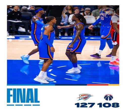 雷霆队,以赛亚乔12中7,三分球9中5轰下了20分6板1助,米切尔15中6独得20分1板2助2断,两人联手从替补席爆发。华莱士12分5板3助4断2帽,在攻防两端表现强势。维金斯7中3,三分球5中1得到了8分4板3助2帽、杰林-威廉姆斯7分9板4助2断、多尔特7分6板1助2断、卡尔森3分2板1助、吉昂2分2帽、卡鲁索5中0得到了0分2板2助3断。