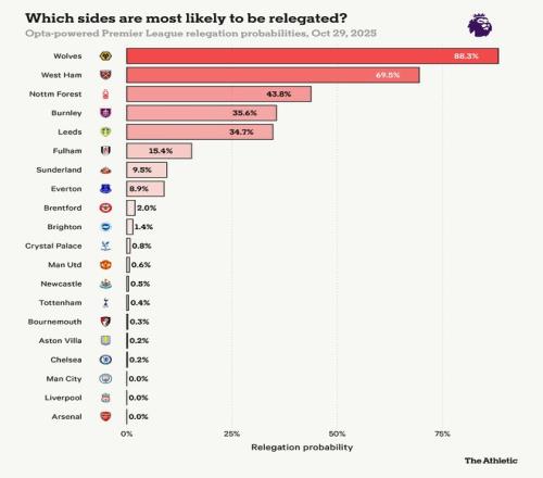在本文提到的球队中,根据Opta的赛季长期预测,埃弗顿是最不可能降级的——降级概率仅为8.9%。这一数字低于桑德兰,尽管后者目前领先六分,埃弗顿更高的生存几率反映了他们的经验和阵容深度。