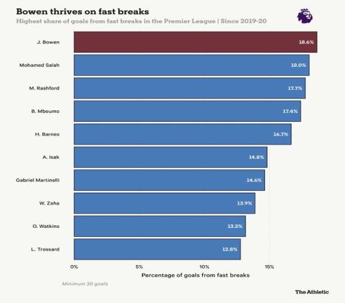 再一次,西汉姆联的希望寄托在他们的护身符鲍恩肩上。这位前锋打进了球队本赛季43%的进球,支撑着他们磕磕绊绊的进攻。至少努诺的反击风格应该能发挥他的优势——自2019-20赛季以来,没有球员在快速反击中进球比例更高。