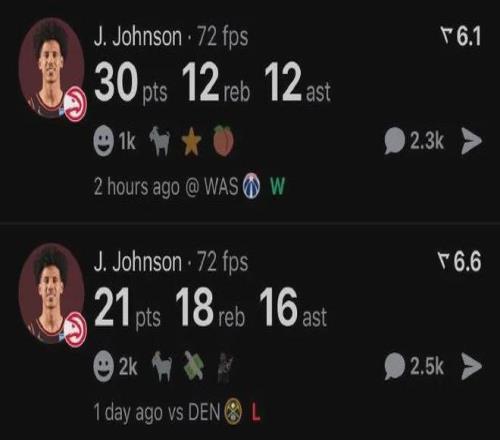 年仅23岁的约翰逊,已成长为新鹰王,本赛季至今场均出战35.2分钟,砍下23.4分10.5板7.9助1.6断,投篮命中率53.4%,场均以40.4%命中率扔进1.6记三分球,带领老鹰以14胜11负排名东部第九,可谓是前途无量。