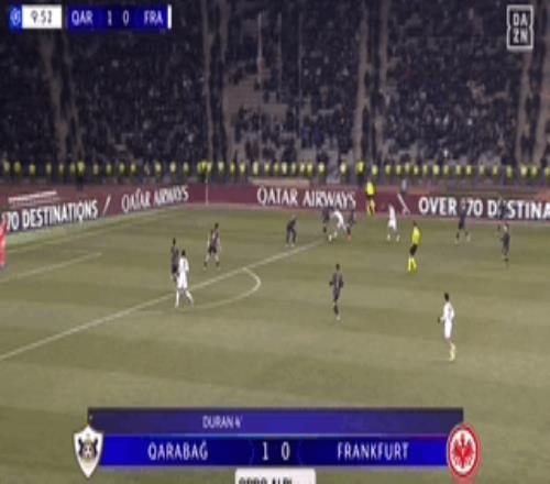 北京时间1月22日欧冠联赛阶段第7轮,卡拉巴赫主场对阵法兰克福。上半场,卡米洛-杜兰先拔头筹,随后乌尊破门扳平比分。下半场,沙伊比点射建功,卡米洛-杜兰闪电扳平梅开二度。补时阶段,穆斯塔法扎达读秒破门完成绝杀。最终法兰克福2-3遭卡拉巴赫读秒绝杀被提前淘汰。