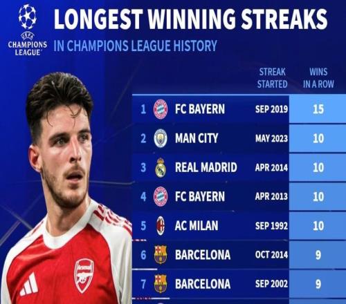 欧冠历史最长连胜TOP10:拜仁15连胜第1,阿森纳并列第10 -